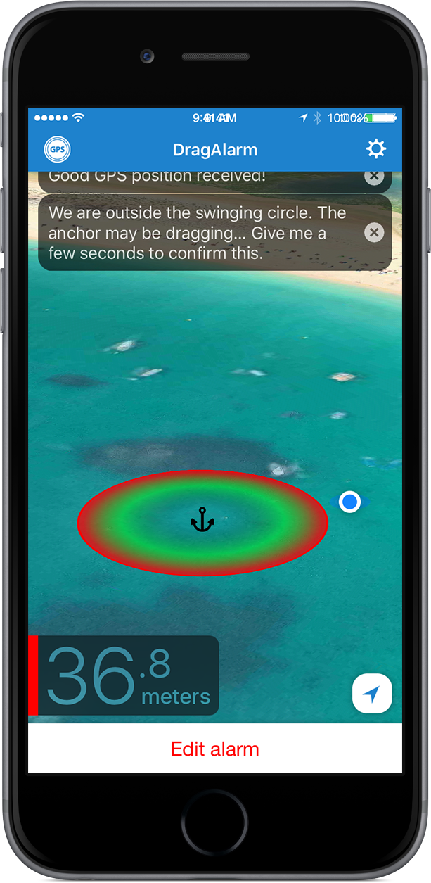 Be careful if your iPhone is in silent mode. The app uses the iPhone's GPS if you are navigating on a ship of great length, consequently the app understands that your boat is dragging. The app is conceived and designed for smaller boats without electronic systems.